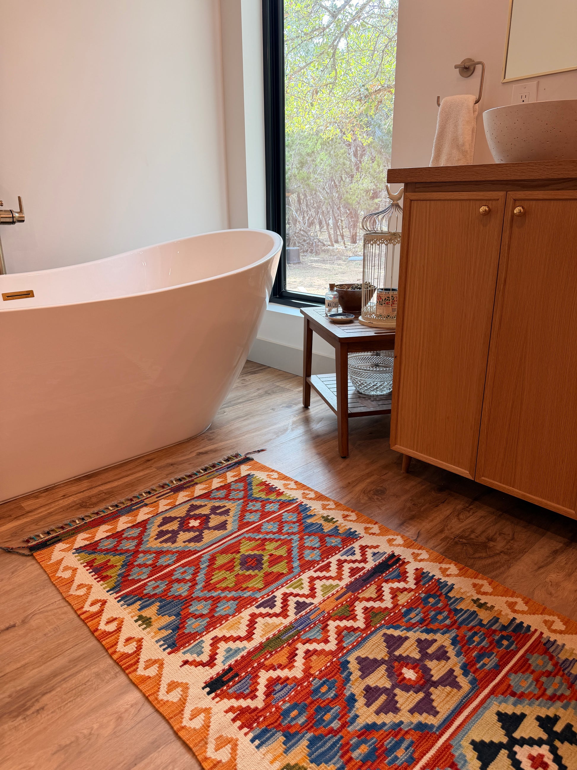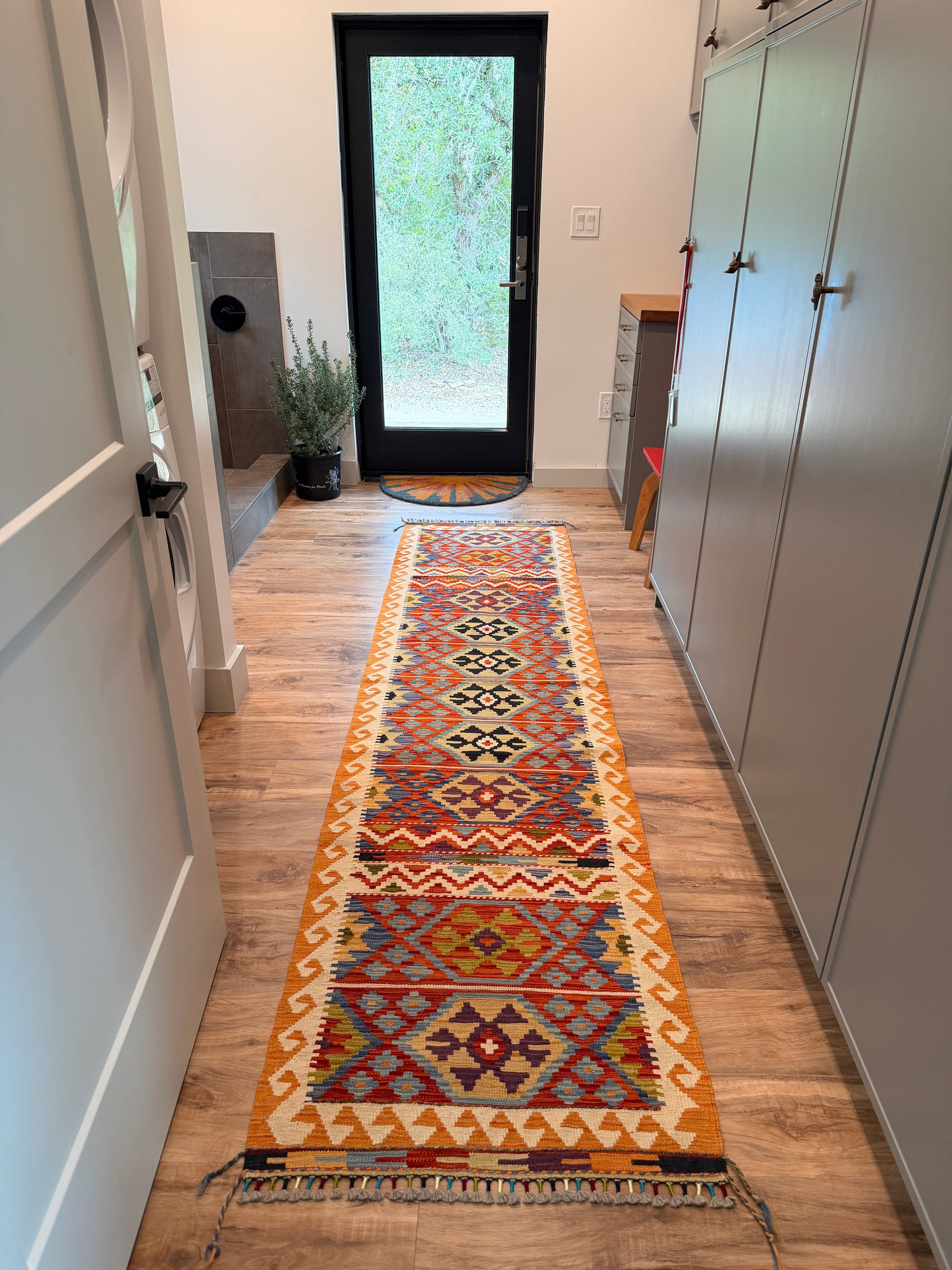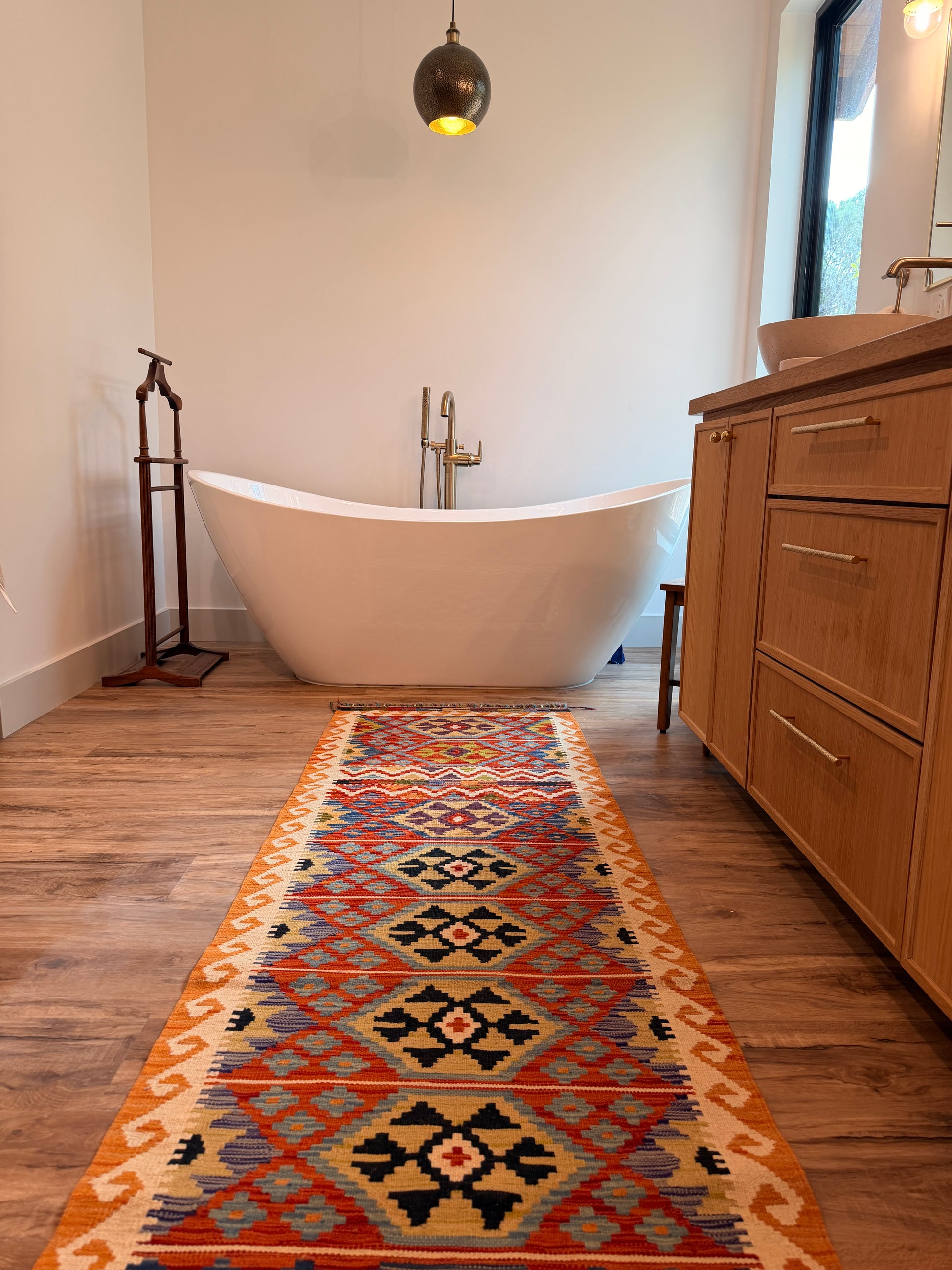 The Santa Fe is a runner with personality — bold enough to stand out, balanced enough to fit anywhere. Meet the runner that brightens the room before the lights even turn on. This hand-woven Turkish kilim bursts with sunrise oranges, soft blues, deep navy motifs, and those classic diamond patterns that bring everything to life.