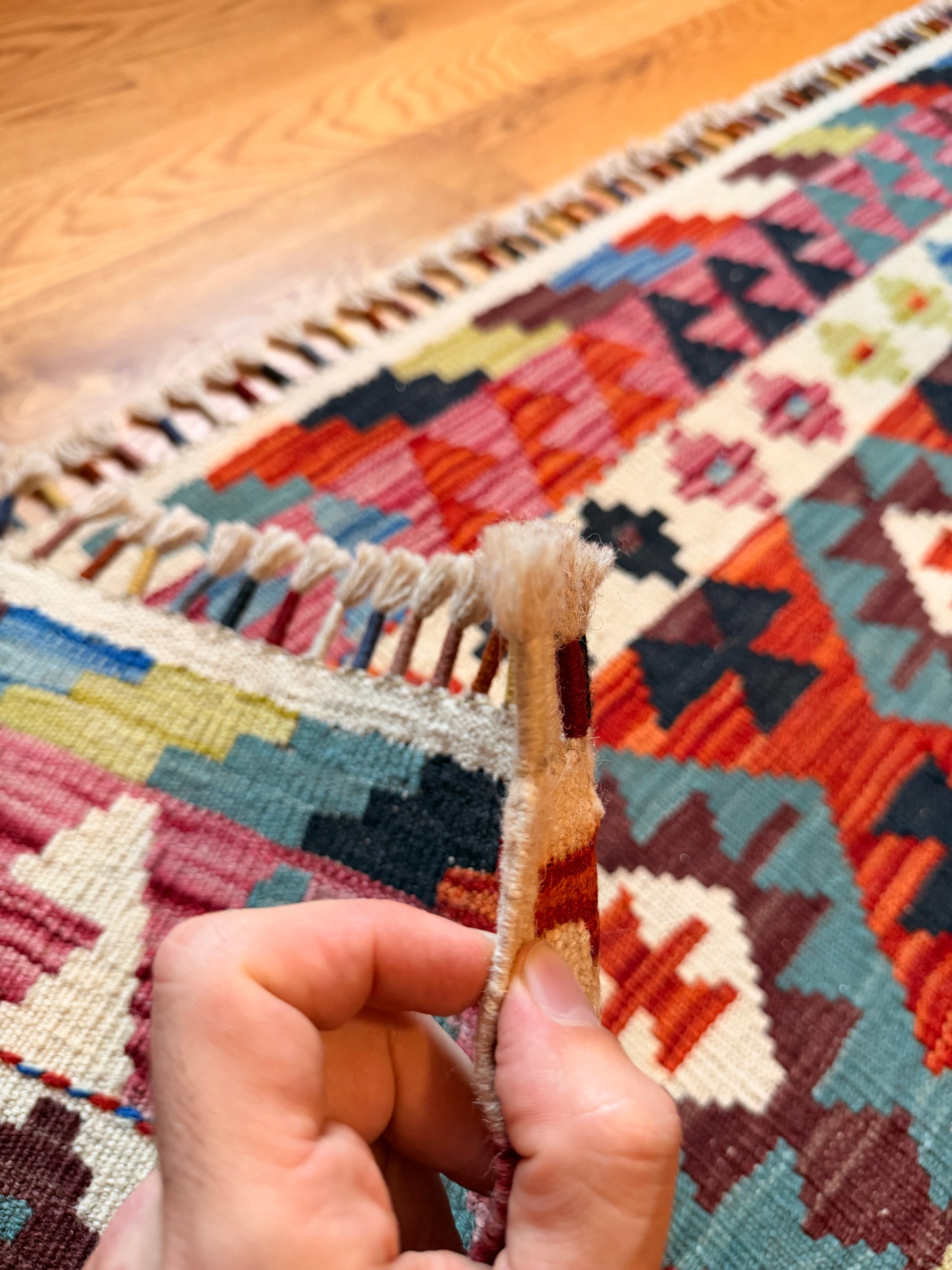 The tassels are hand-knotted using natural dyes, completing the kilim with a distinctive, beautifully finished look.