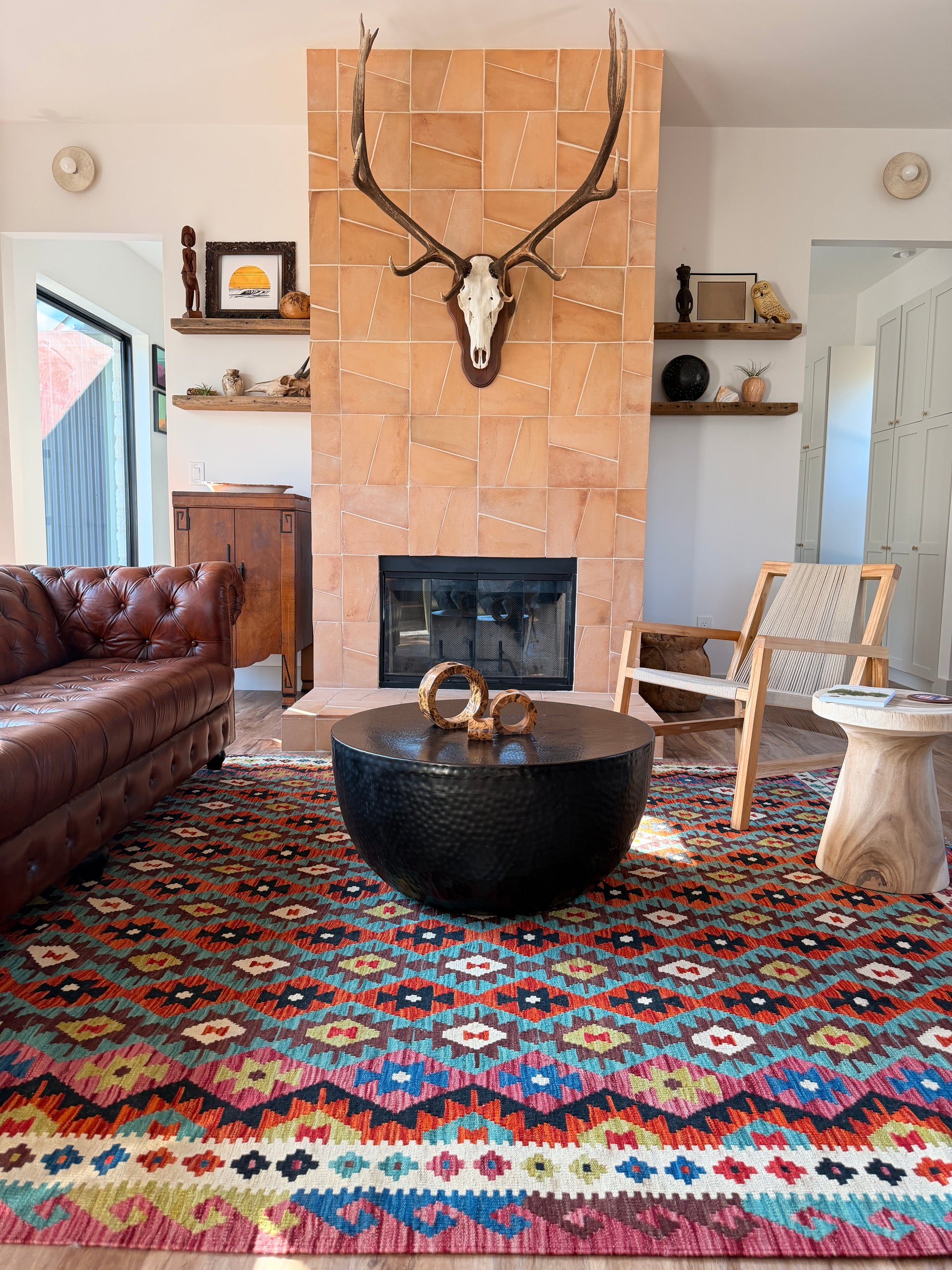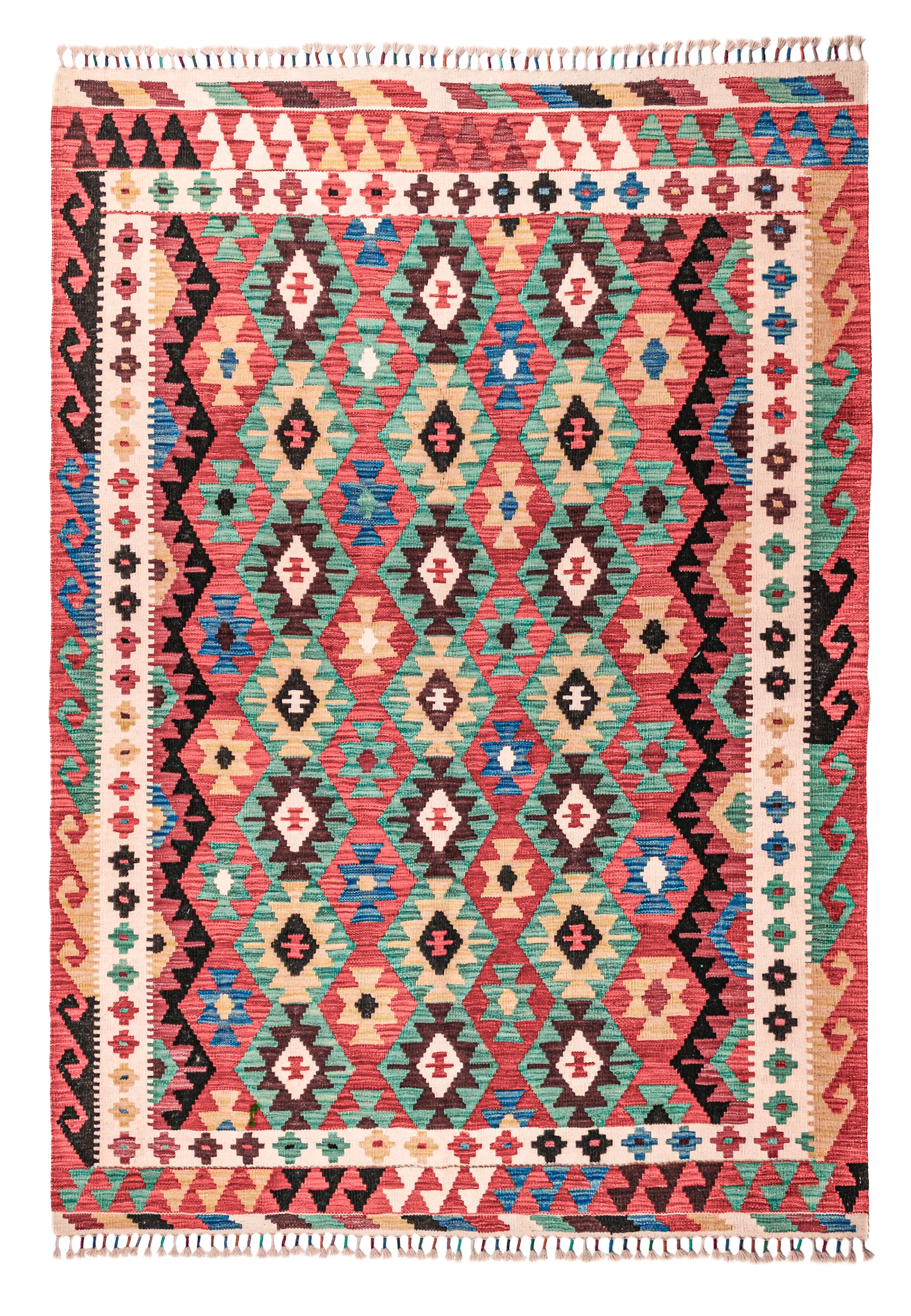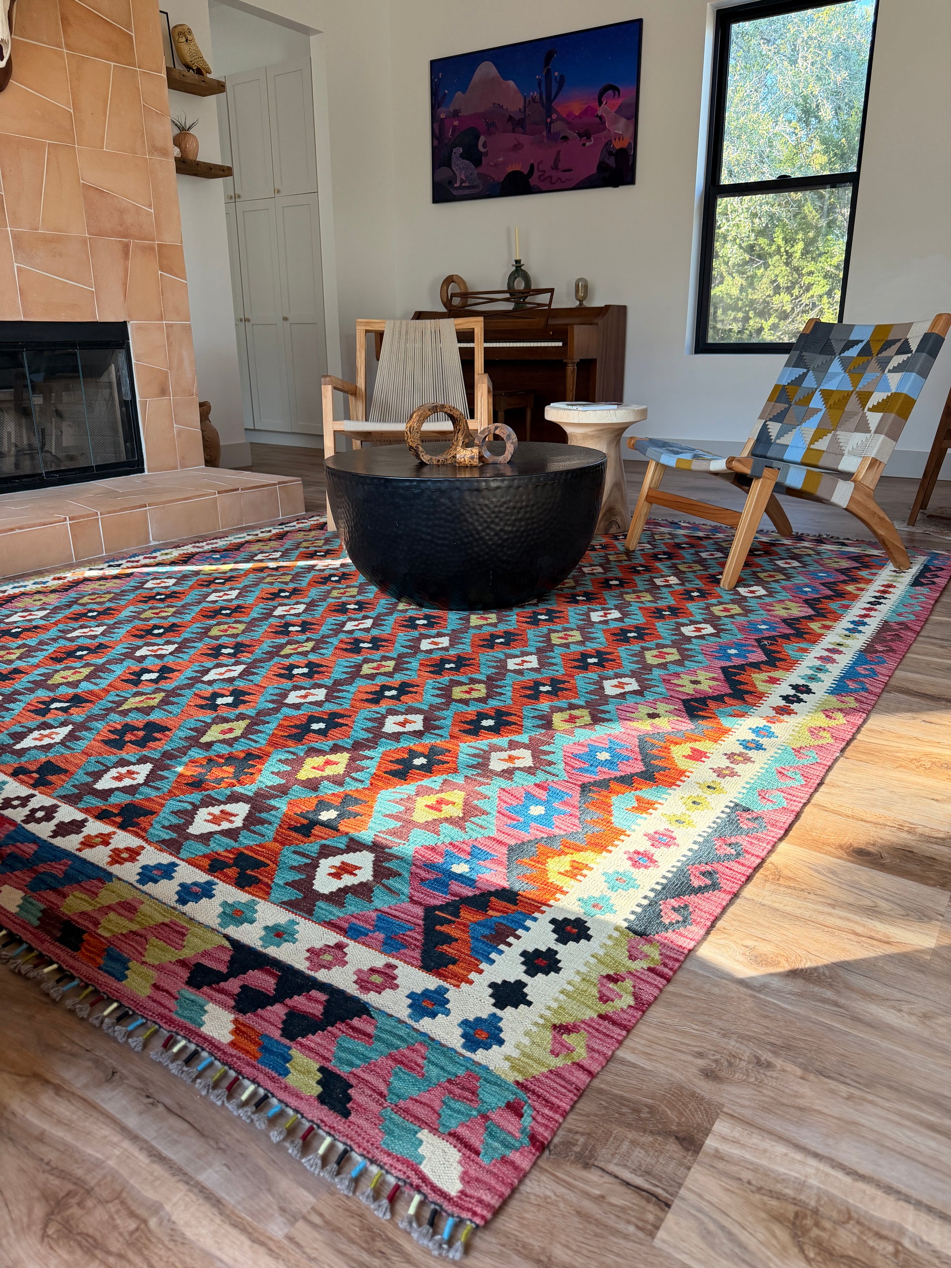 The Sedona is an handmade Turkish kilim rug that brings vibrant color and authentic Anatolian craftsmanship into your home. Woven from scratch on traditional looms, it features bold geometric and diamond motifs in rich, sun-dried tones such as fuscia, deep turquoise, and burnt orange.